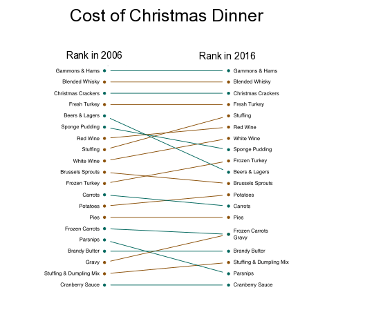 The slope chart above shows the rising cost of Christmas Dinner in U.K. The plot is generated in R using the plotrix library. Once the basic plot was generated a few minor adjustments were made using the inkscape.