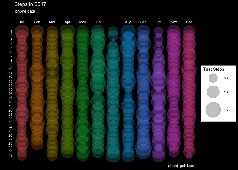 labs(x = "Month", y = "Days",size="Test Steps", title="Steps in 2017",caption="atmajitgohil.com", subtitle ="Iphone data")+