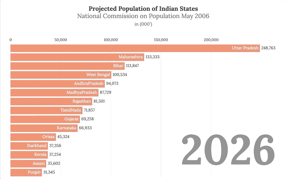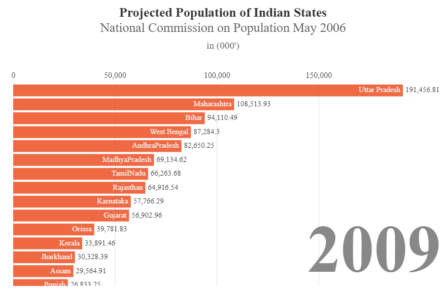 In the present post an animated bar race chart shows the growing population of Indian states from 2001 to 2026. The states of Uttar Pradesh, Maharashtra and Bihar show the highest population projection over the entire time period. An analysis of projected population helps in better resource management, planning and policy implementation. It would be interesting to see if the gender gap has reduces or increases in these states.
