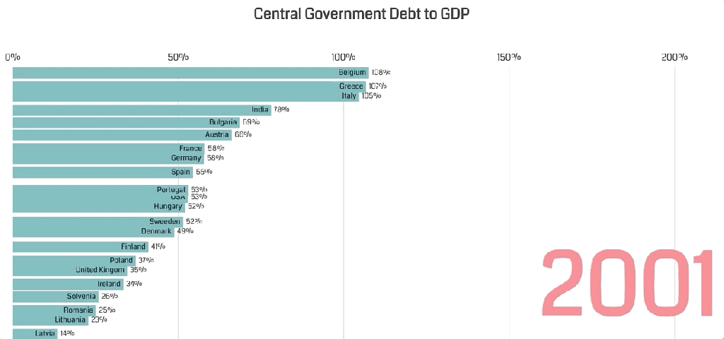IMF provides data on government debt and thought of analyzing the trends in government debt specifically the time frame pre-crisis (2007) and post-crisis (2009). The animated bar chart highlights the percentage of debt rising in troubled economies such as Greece, Italy, Portugal, USA and Belgium post 2007. These economies saw a substantial rise in debt to GDP ratio post 2007 i.e. debt was over 100% GDP.