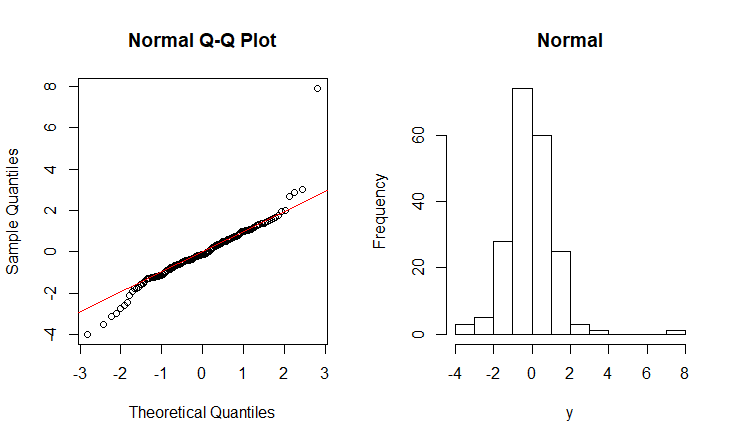 The code below shows the output from the jarque.bera.test() function using a random normal data. We can always substitute the random data with residuals from linear regression to test for normality. The high p-value (>0.05) indicates that we fail to reject the null and the data is normally distributed.