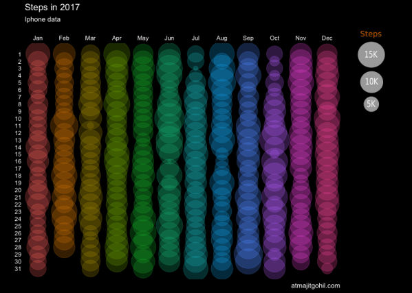 The circular plot is generated using gggplot2 and Iphone health data showing the number of steps walked during 2017.