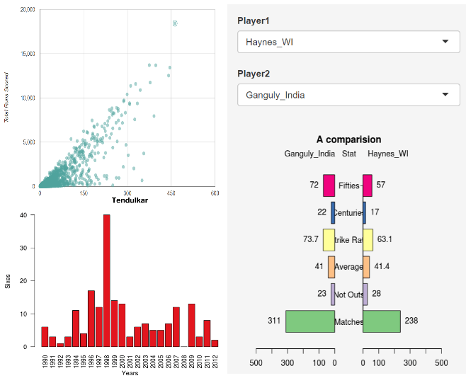This shiny app was my first time working with shiny and hence some of the plots are not well constructed. However, the main idea was to communicate runs scored by batsman including 4’s and 6’s. The data for the app was sourced in 2015 using a web application called kimono ( no longer available). In present day an R package ‘cricketr’ is available which has made the process of extracting data much easier.
